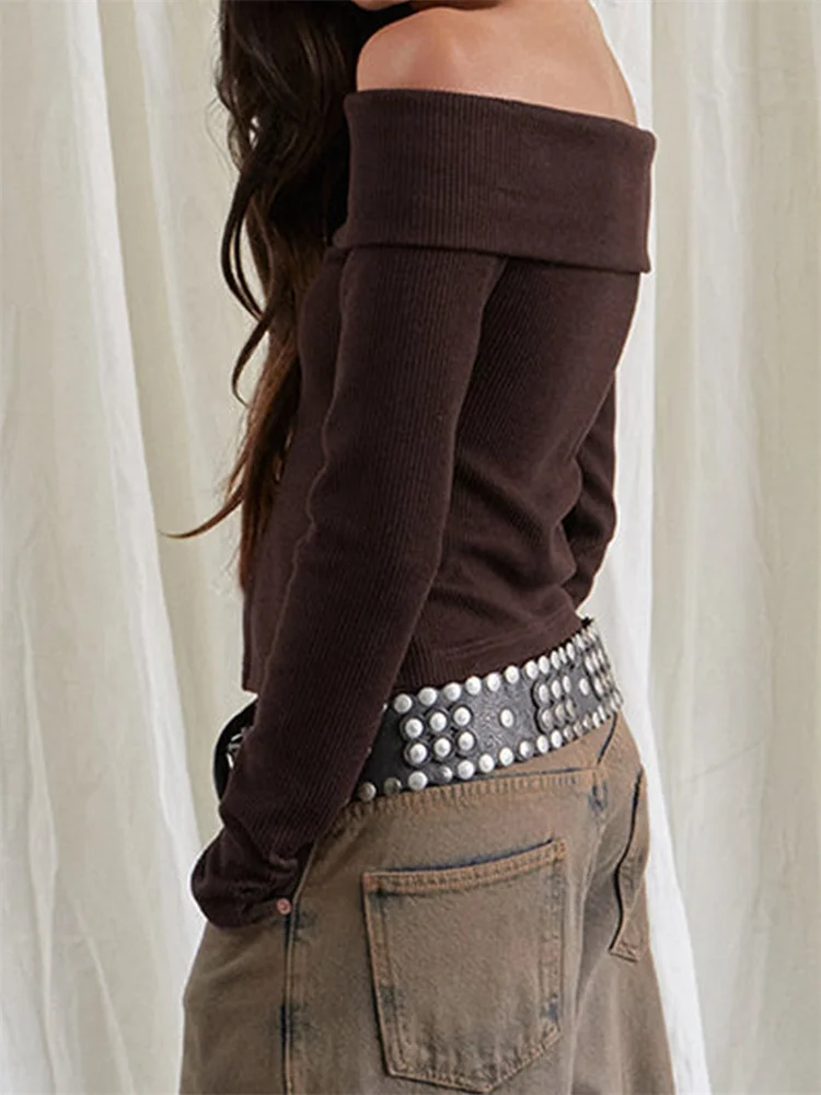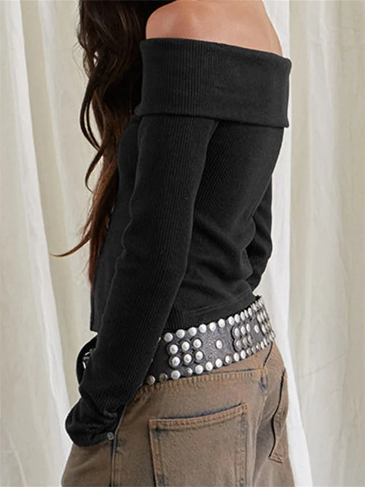 Long Sleeve Neck Off-shoulder Tops Buttons Closure Solid Slim Fit